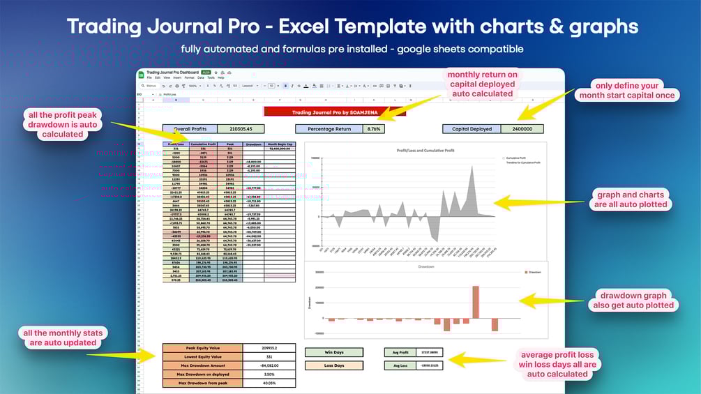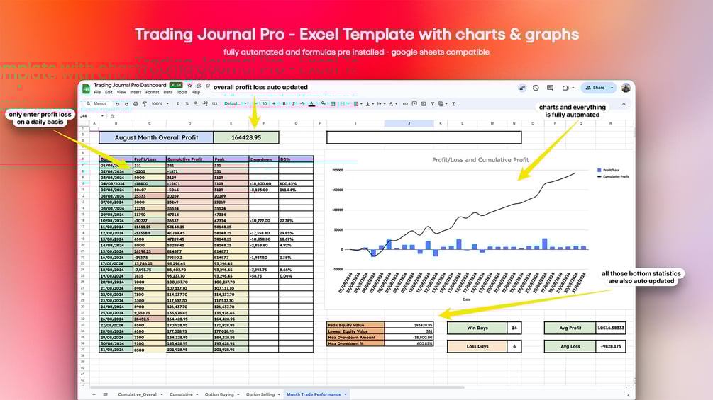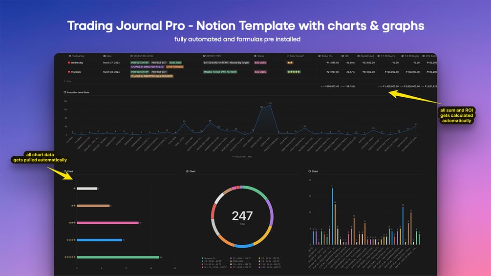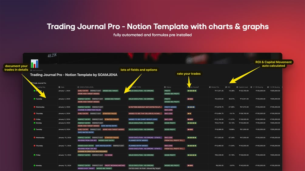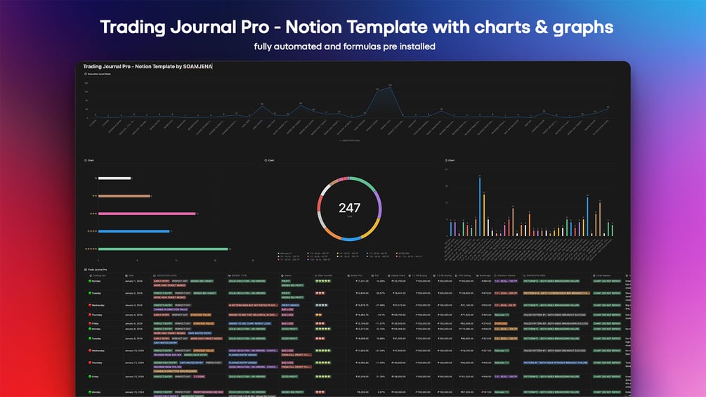 The Trading Journal Pro Template is a comprehensive tool designed for traders, built using Notion and Microsoft Excel. It allows you to meticulously track your trades, analyze performance, and refine your trading strategies. With customizable fields and detailed analytics, this template provides a seamless experience to enhance your trading efficiency and decision-making process. Perfect for both novice and experienced traders, the Trading Journal Pro Template ensures you stay organised and informed.